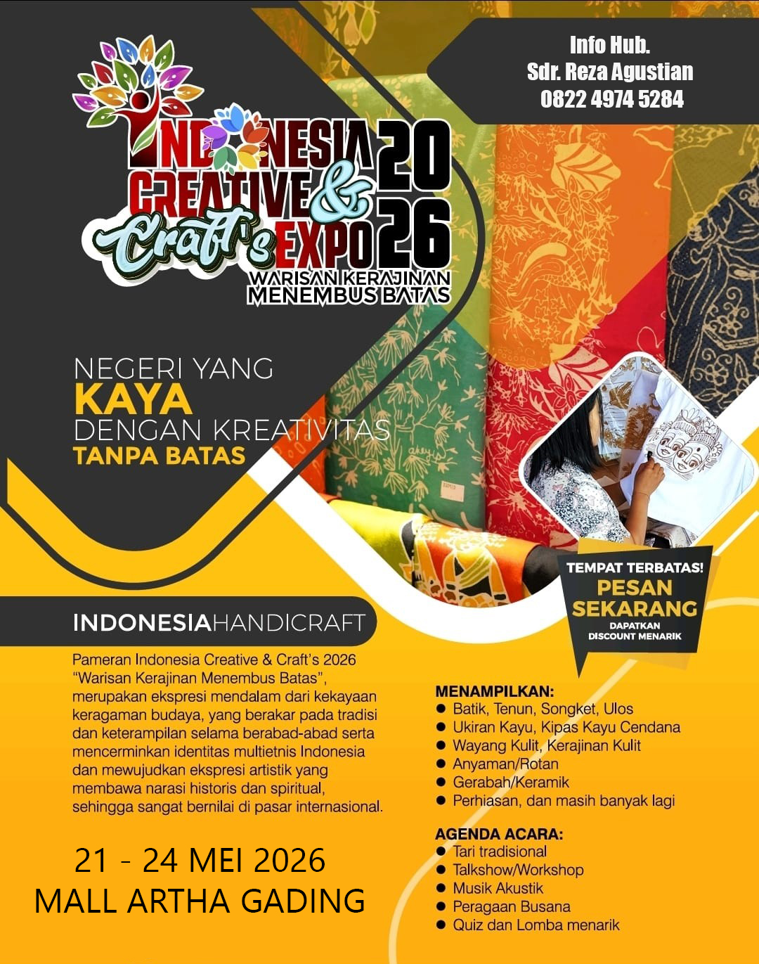 INDONESIA CREATIVE & CRAFT EXPO 2026 adalah pameran “Warisan Kerajinan Menembus Batas” merupakan ekspresi mendalam dari kekayaan keragaman budaya, yang berakar pada tradisi dan keterampilan selama beradab-abad serta mencerminkan identitas multi etnis Indonesia dan mewujudkan ekspresi artistik yang membawa narasi historis dan spirituall sehingga sangat bernilai di pasar Internasional.